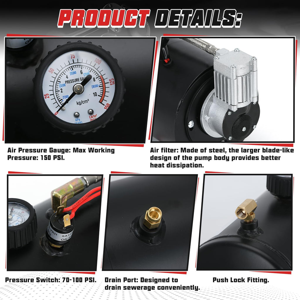 Unleash the power of instant air pressure with this rugged and reliable 12-volt air compressor, designed to bring efficiency and convenience wherever you need it. Whether you're outfitting your SUV, truck, RV, or marine vehicle, this compact powerhouse is your ultimate companion for powering high-pressure air horns and other air pressure needs. Imagine the thrill of having an onboard air system that delivers stable and rapid air pressure, helping you keep your truck or car fully equipped for every adventure.