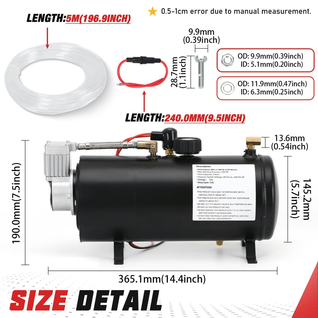 - Ample Air Tank Capacity: Featuring a sturdy 3-liter (0.8-gallon) tank, it stores enough compressed air to power your air horn or inflate your tires quickly. This tank size strikes a great balance between portability and performance, letting you conquer your ride-on adventures without frequent refills or interruptions.