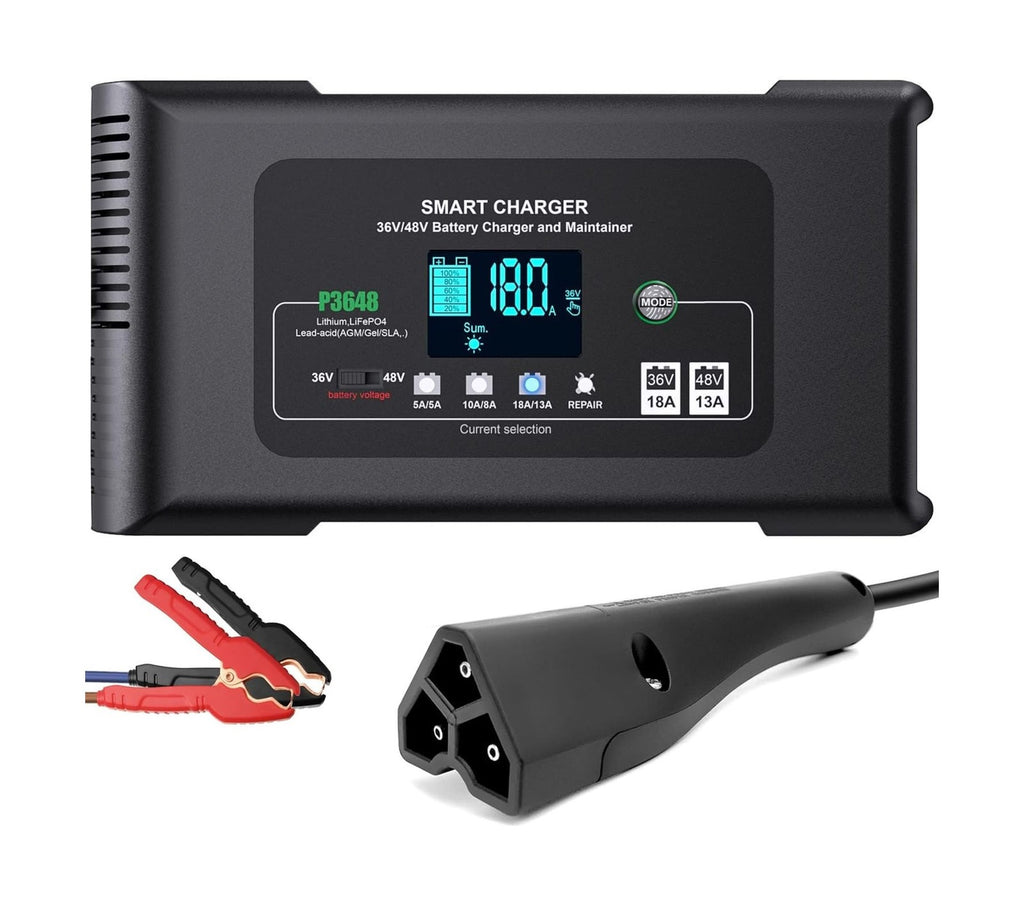 - Rapid Charging with Flexible Voltage Modes: Switch effortlessly between 36V and 48V modes depending on your battery’s requirements. The charger outputs 18 amps at 36 volts and 13 amps at 48 volts, allowing your ride-on golf cart to regain full power quickly so the fun never has to stop.