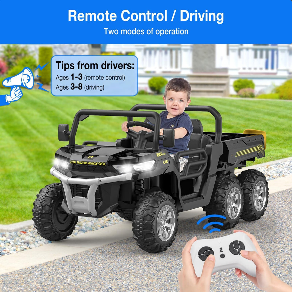 Crafted with vibrant black coloring and built for durability, this ride-on dump truck stands out with its commanding presence and robust features. Powered by a potent 24-volt 7AH rechargeable battery and driven by four 75-watt motors, the truck boasts a 4-wheel drive system and six sturdy wheels that conquer various surfaces with ease. This combination offers a smooth yet dynamic ride, allowing your child to reach speeds up to 5 miles per hour, adjustable to their comfort and skill level.