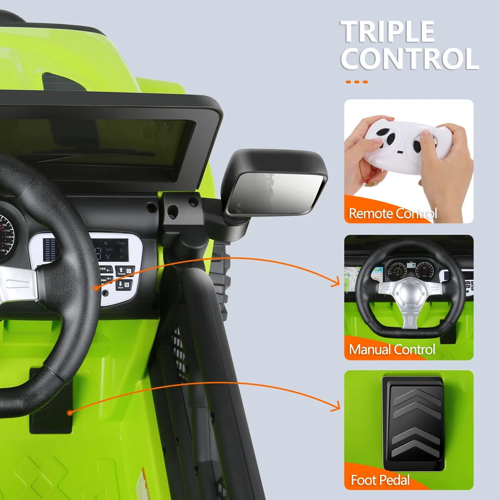 - Control Options: Foot pedal acceleration, real steering wheel, and 2.4 GHz remote control for parents