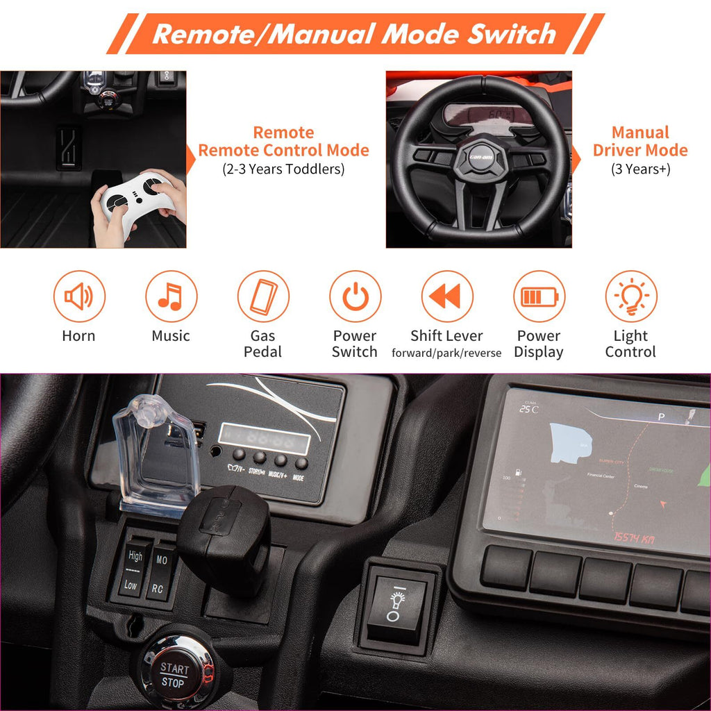 From the moment your child climbs into the spacious 23-inch large seat, designed to comfortably fit two young riders, they’ll feel like real drivers hitting the dirt trails or cruising the neighborhood. Whether your child takes the wheel or you guide the fun with the included remote control, this ride-on UTV is built to deliver hours of exciting, safe entertainment.