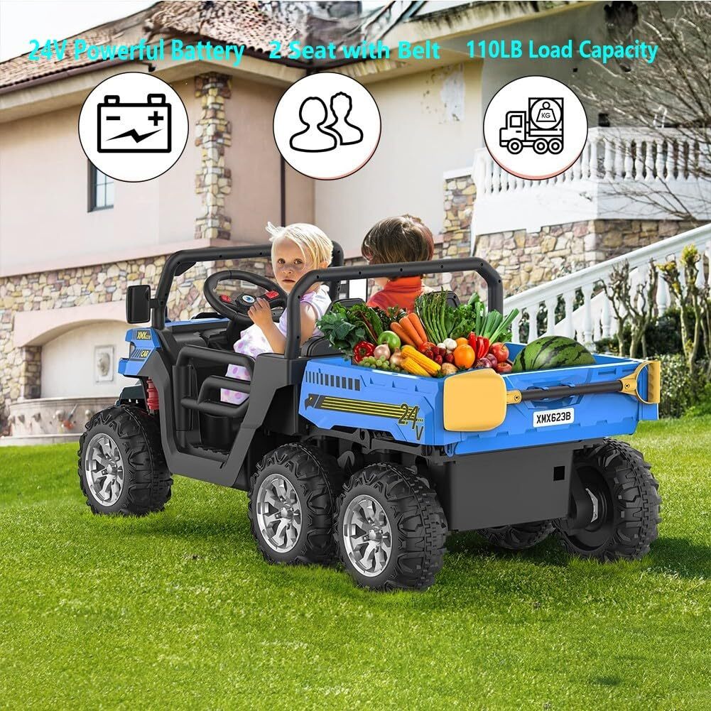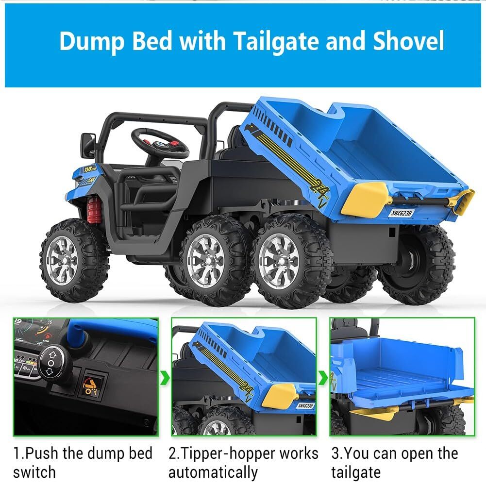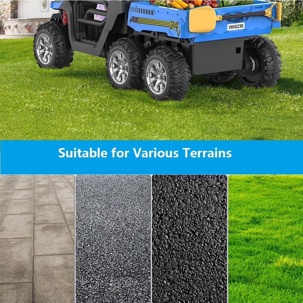 Powered by four robust 24V 75W electric motors, this ride-on dump truck offers enough muscle to conquer diverse terrains. Six oversized 11-inch wear-resistant wheels provide excellent traction and stability, allowing the truck to smoothly roll over flat roads, grassy fields, and gravel paths alike.