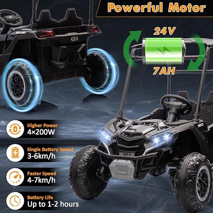 - Powerful 24V Battery & Motors: With four 200W motors driven by a 24V 7AH battery, your child will experience smooth acceleration and strong traction on diverse terrains.