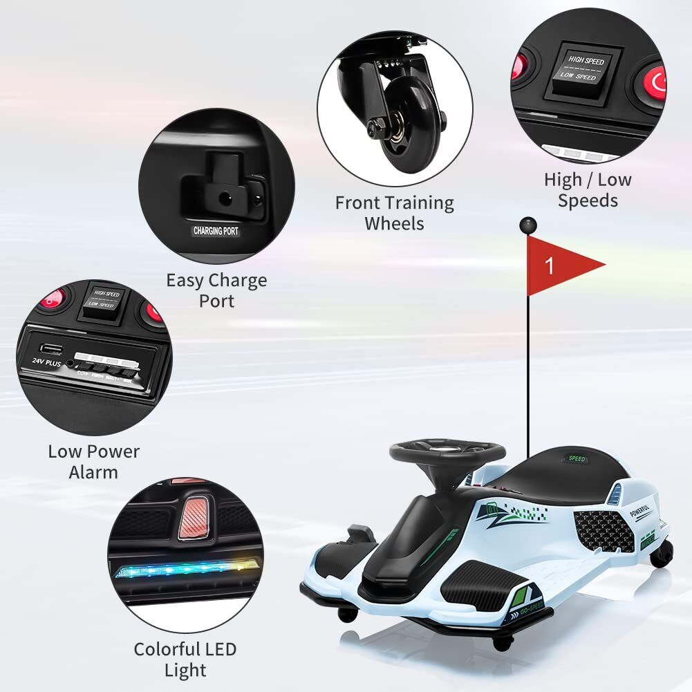 - Drift Racing Excitement: This 24V drift car features variable speed foot pedal acceleration and a 180W powerful motor. It can reach speeds of 1.9-5mph in low speed mode and 4.9-7.5mph in high speed mode.