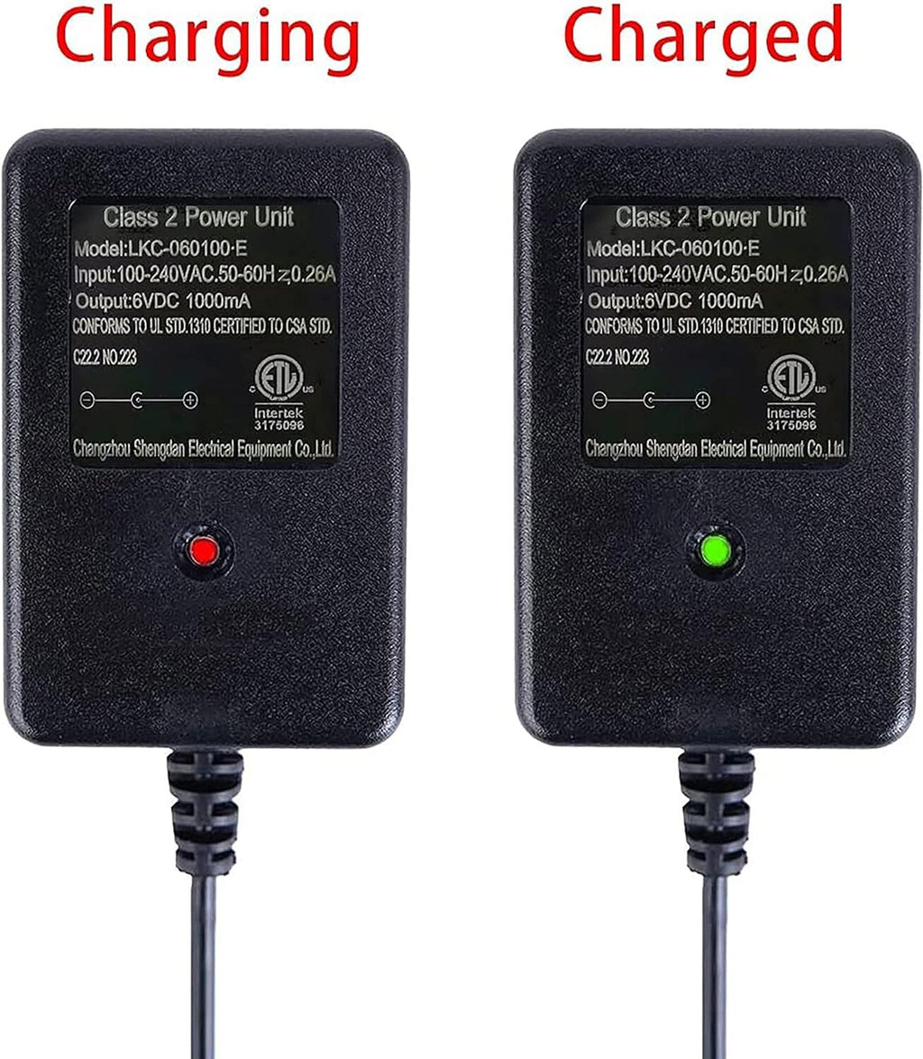 - How long does it take to fully charge? Typical charging time is 8–12 hours for a completely depleted 6V battery. The LED indicator will turn green when finished.