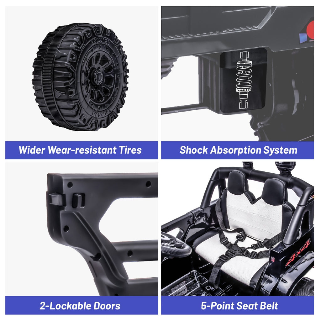 - Spring Suspension & Wear-Resistant Tires: Integrated shocks under each wheel cushion bumps and dips, making off-road adventures smoother. The wide rubber tires grip terrain without scraping the chassis.