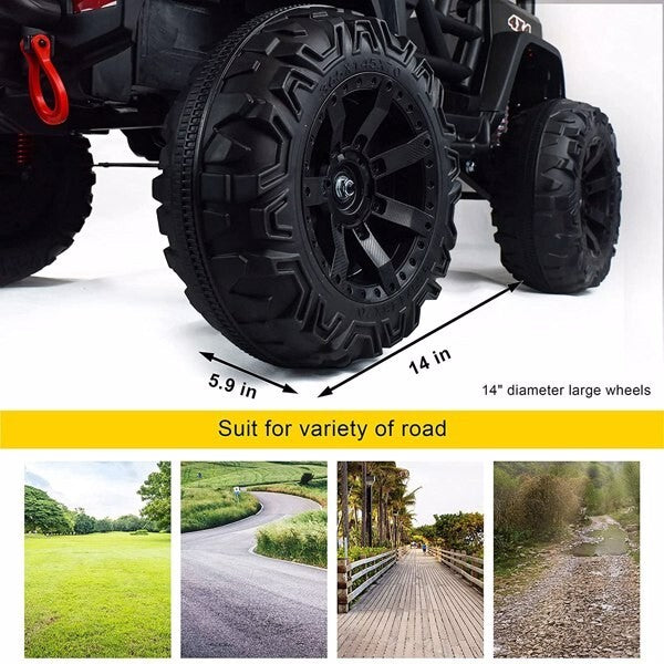 - Comfortable Ride: Four 14-inch off-road wheels featuring spring compression shock absorbers soak up bumps and uneven terrain, delivering a smooth, stable ride across driveways, lawns, ramps, and even sandy beaches.