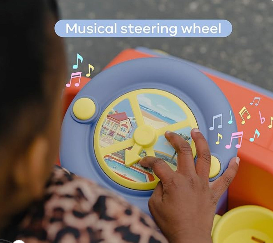 - Interactive Dashboard: A realistic steering wheel fitted with buttons triggers lights, sounds, and melodies. Requires 2 AAA batteries (not included) for sound modules so you can customize your child’s audio experience.