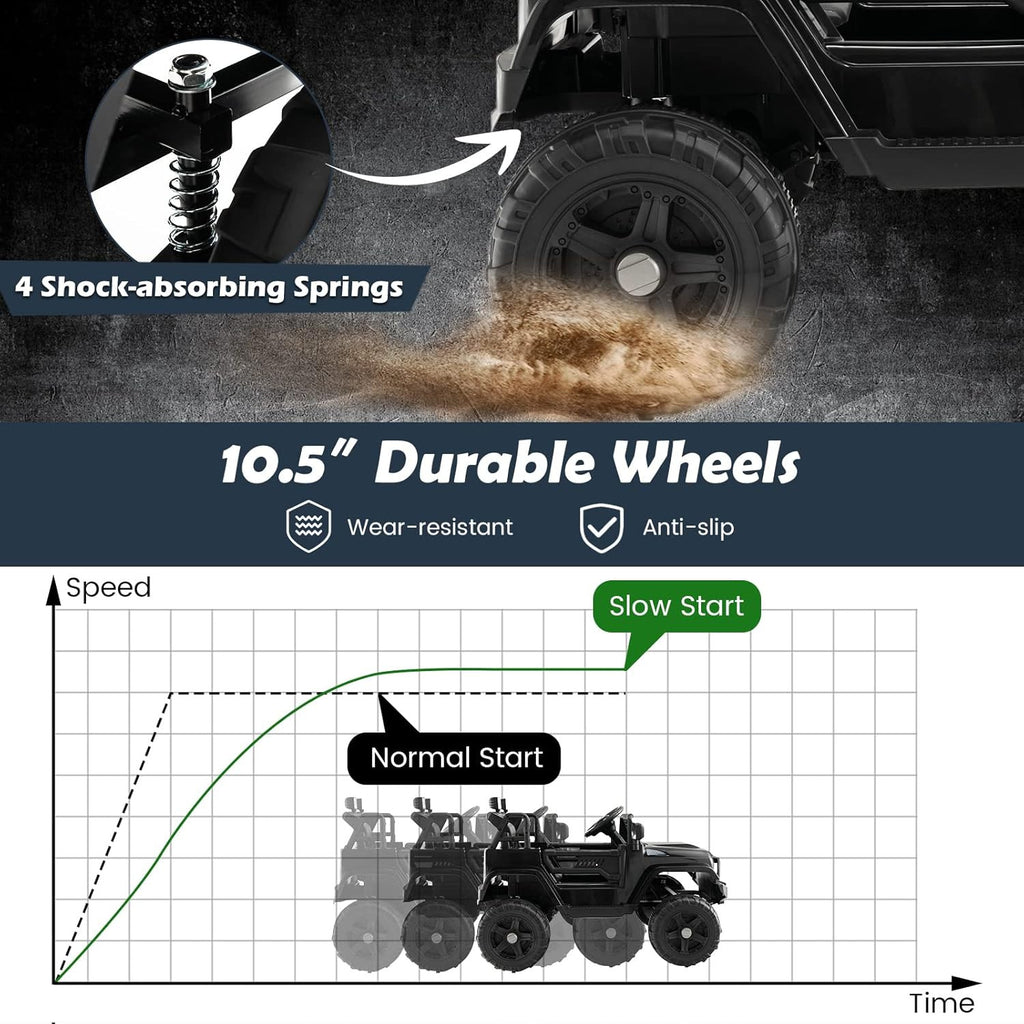 Equipped with four spring suspension shocks and durable, non-slip wheels, this truck is ready to handle a variety of terrains without compromising comfort. Whether cruising over grass, gravel, or pavement, the suspension system absorbs bumps and vibrations, delivering a smooth ride that lets your child feel like they’re truly commanding a real truck.