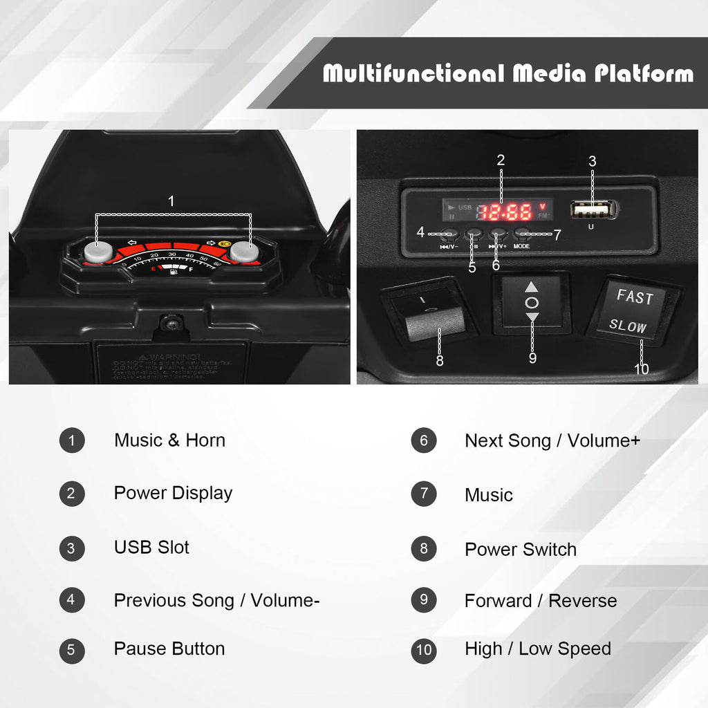 - Built-In Sounds & Music: Ignite playtime with engine revs, horn blares, and joyful tunes all at the flick of a switch. You can also plug in a phone or MP3 player via the USB slot to play your child’s favorite songs or bedtime stories during their drives.