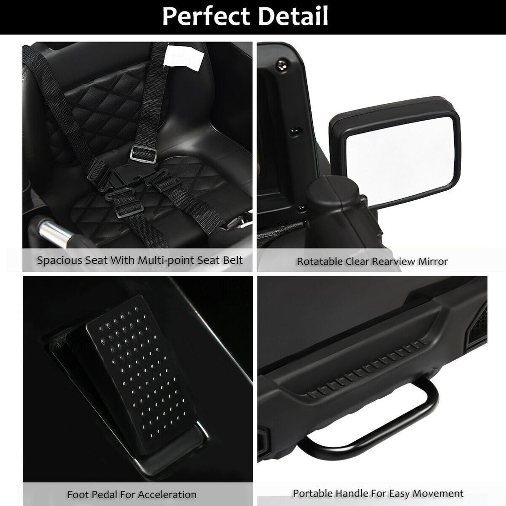 - Eye-Catching Glossy Black Finish: This ride-on truck’s matte-black exterior with realistic grille and bumper elements looks just like a grown-up vehicle. It’s the perfect combination of cool and classic that kids can’t resist.