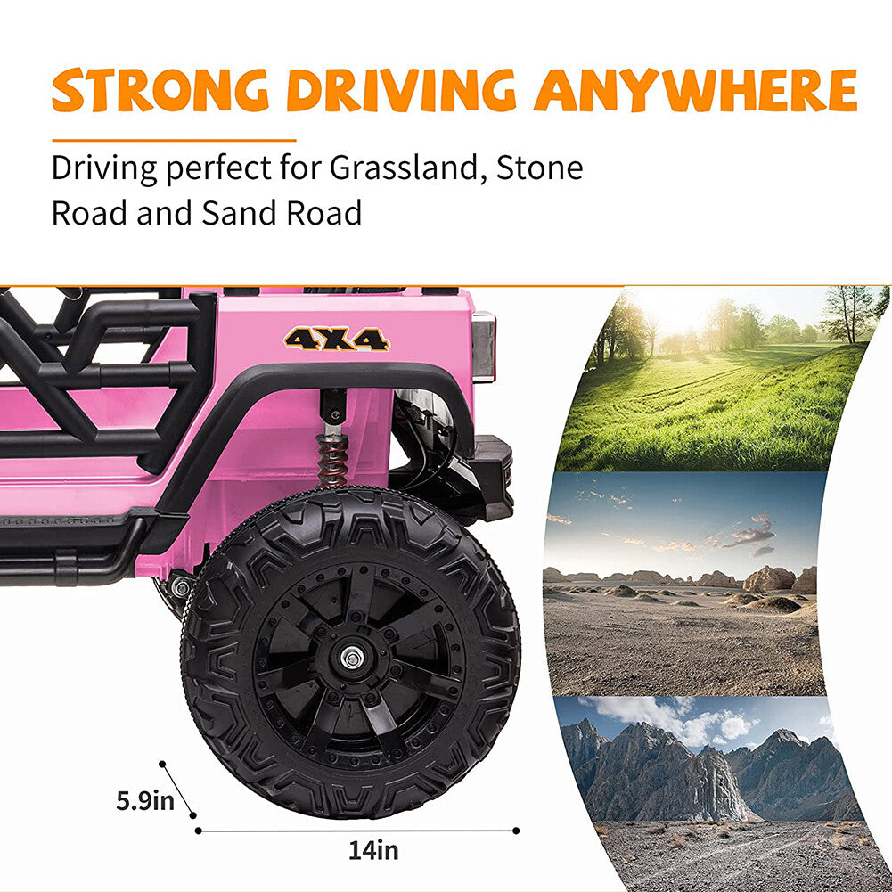 - All-Terrain Performance: Massive 14.6″ diameter wheels with integrated spring suspension handle ramps, lawns, pavements, stone driveways, and even sandy patches with ease. Watch your kids conquer every obstacle like little off-road champions.