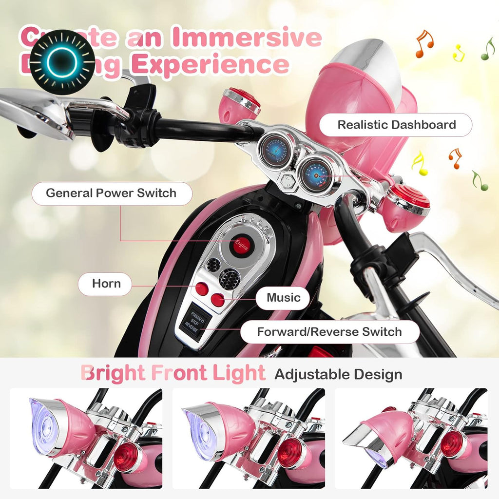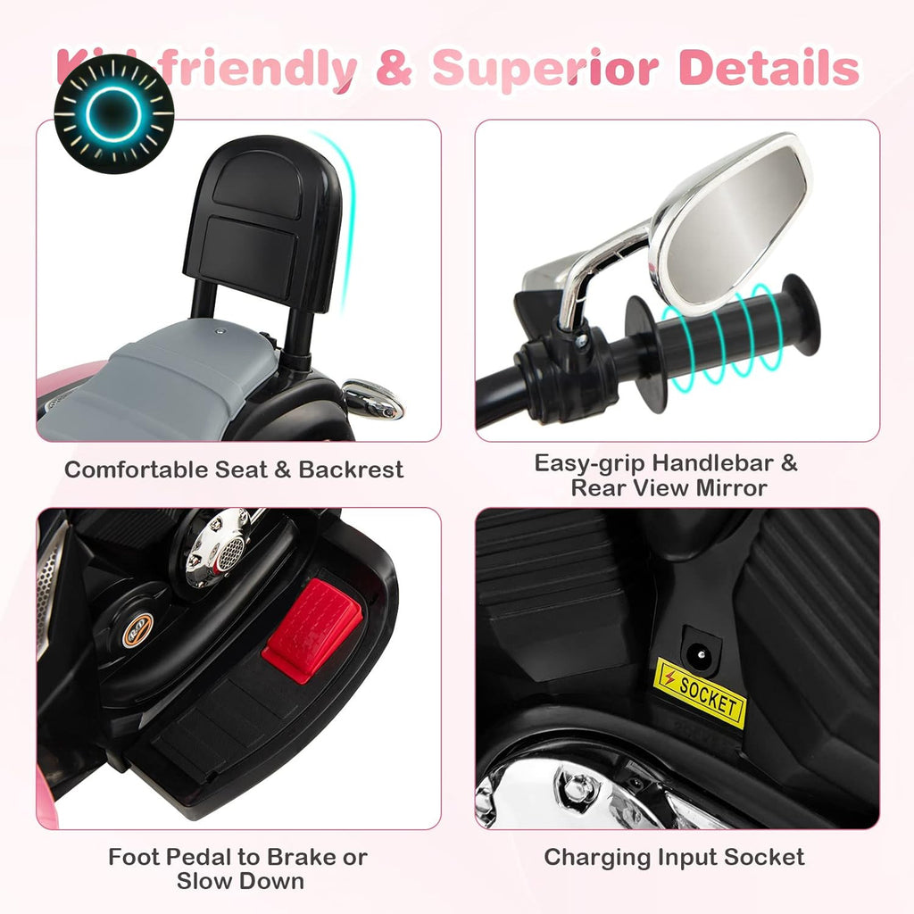 - Foot Pedal & Direction Button: A large, responsive foot pedal accelerates the ride-on motorcycle forward, while an easy-to-reach direction button offers reverse control. Kids will love feeling like a real rider as they navigate playtime adventures.
