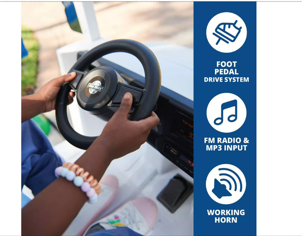 Assembly is simple: attach the Power Trax tires, secure the mailbox and seats, connect the battery, and your child’s ride-on truck is ready for duty. The intuitive foot pedal accelerates the truck, while a toggle allows easy switching between forward and reverse. Headlights light up automatically when the engine starts, and the horn button adds a dash of realism. Plug in your child’s favorite playlist to the FM/MP3 interface, and the adventure is off to a melodic start.