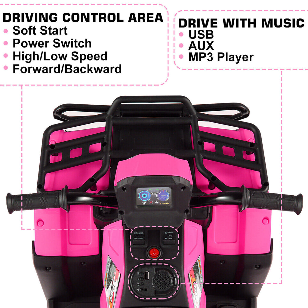 - Entertainment Options: Built-in stories and music, along with AUX and USB ports, keep kids entertained during their ride. The ATV also features bright LED headlights for extra visibility and fun.