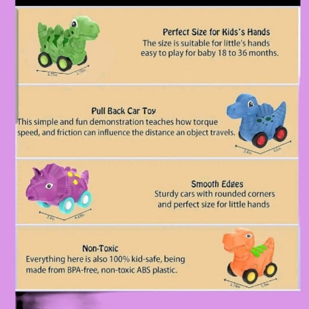 - 5 Small Pull-Back Dino Cars: Each dinosaur-themed car is bursting with personality, color, and speed! Simply pull each dino car back and release to see them zoom forward, racing across floors, carpets, or driveways. Every ride-on dino car features a different dinosaur design, ensuring variety and excitement at every turn.
