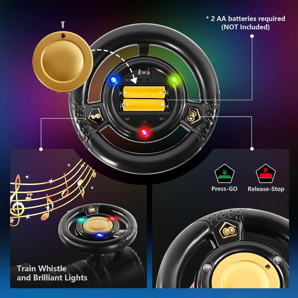 - Immersive Sound & Lights – Hit the start switch, and the whistle sounds, creating the authentic railroad atmosphere. Three bright LED lights flash in red, green, and blue, turning each ride-on session into a tunnel of light and sound—perfect for little conductors who crave excitement.