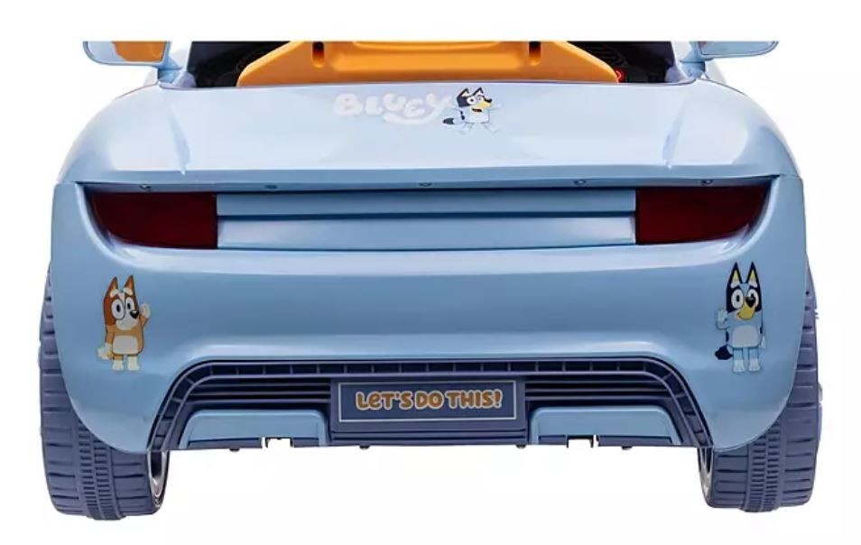 Infused with the playful spirit of Bluey, this ride-on car captures the energy of backyard escapades and pretend-play adventures. The cheerful blue exterior is accented with whimsical paw-print decals and lovable character images on the dashboard.
