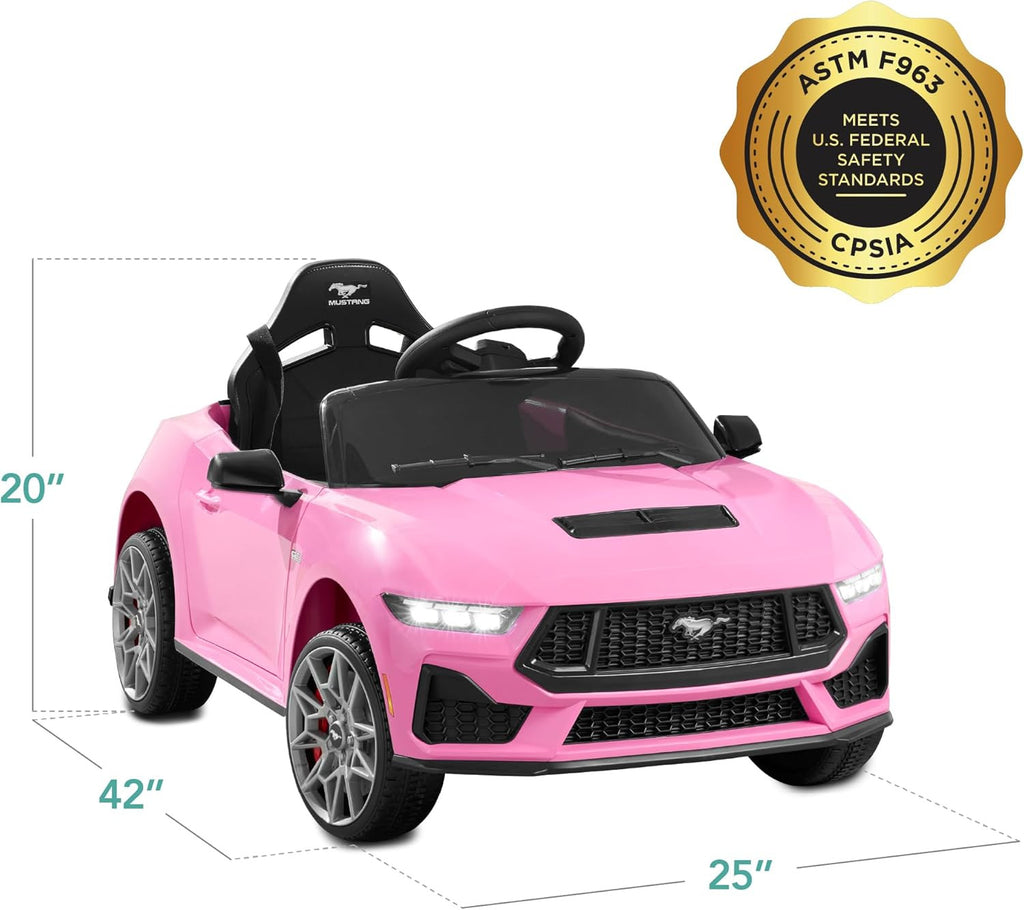 Bring home the officially licensed Ford Mustang 12V electric ride-on car in pink today and give your child the gift of adventure, creativity, and freedom. Watch them conquer curbs, glide across lawns, and cruise down sidewalks as they create memories that will last a lifetime. Let the journey begin!