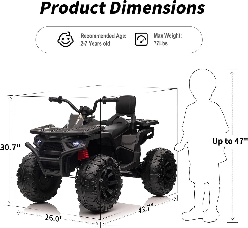 - Easy Tow Handle – Parents, rejoice! When the adventure pauses and the ride-on battery runs out, simply use the rear tow handle to pull the ATV without straining your back. The front wheel motor shuts off automatically, making it easy to bring the fun back to the charging station.