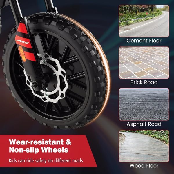 Equipped with two sturdy training wheels, this ride-on motorcycle offers unbeatable stability for beginners still perfecting their balance. These extra wheels prevent tipping and provide peace of mind for parents, allowing your child to focus on mastering their riding skills without the fear of falling. Plus, the anti-skid, wear-resistant tires are designed to conquer a variety of surfaces — whether it's your driveway, sidewalk, or smooth park paths — offering a steady grip that supports safe rides on different terrains.