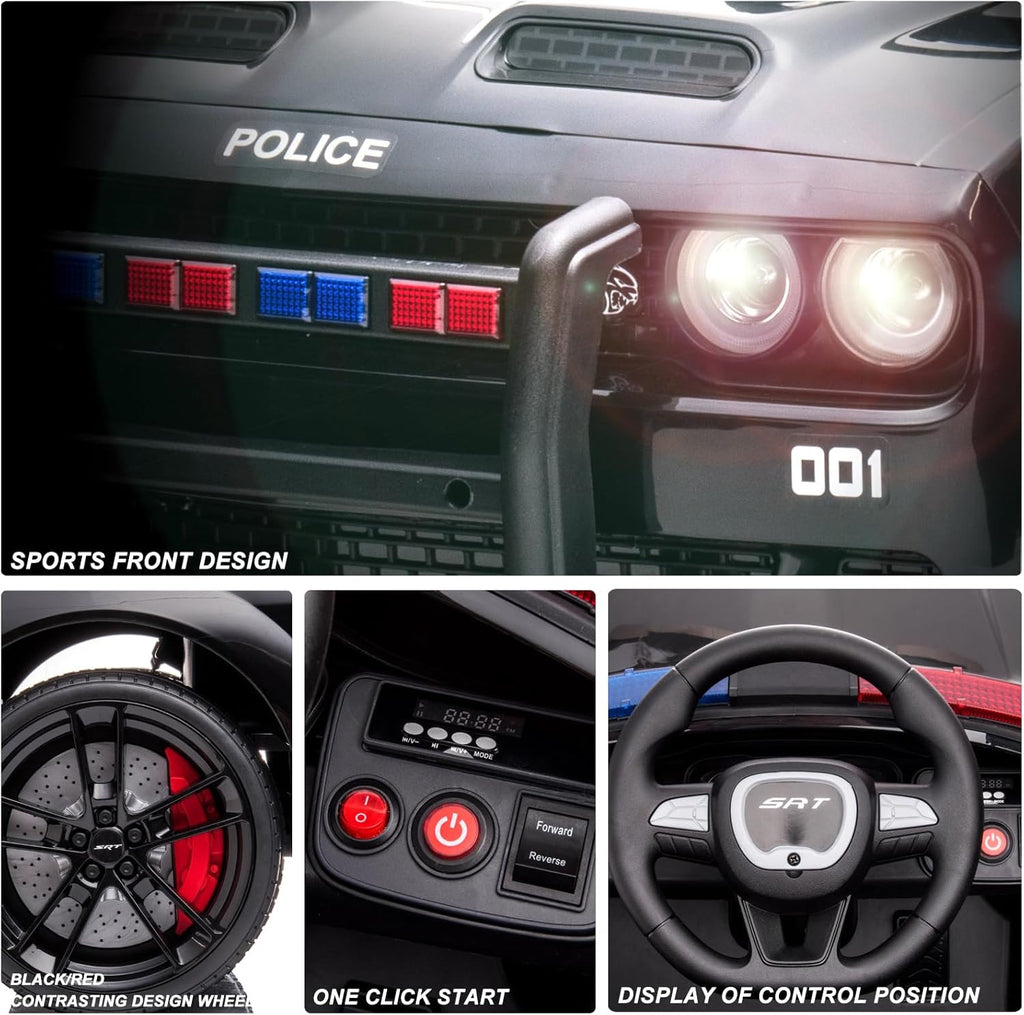 - Authentic Patrol Cruiser Design: With its distinctive black-and-white paint scheme, realistic decals, and “POLICE” lettering, this ride-on car instantly transforms your child into a heroic officer of the law. The official Dodge Challenger styling, complete with a bold front grille and side mirrors, makes every drive feel like a scene from an action-packed movie.