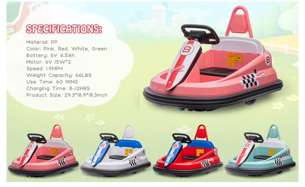 - Durable 6V Battery: Powered by a reliable 6-volt rechargeable battery (charger included), this electric bumper car offers 45–60 minutes of nonstop play on a full charge. It’s enough time for a backyard race or a neighborhood parade!