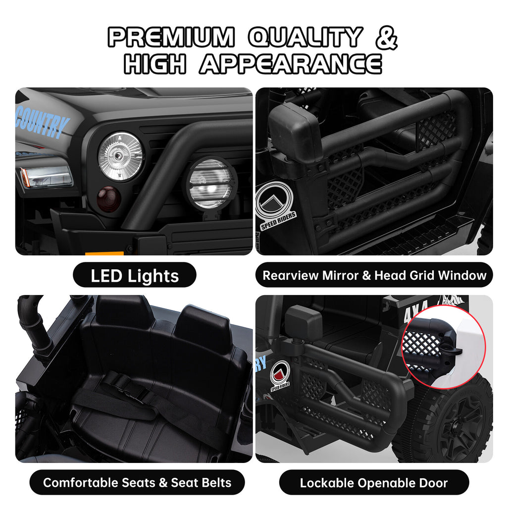 - Multifunctional Console: Features MP3 player, AUX input, USB port, Bluetooth speakers, horn, LED headlights, and high/low speed settings.