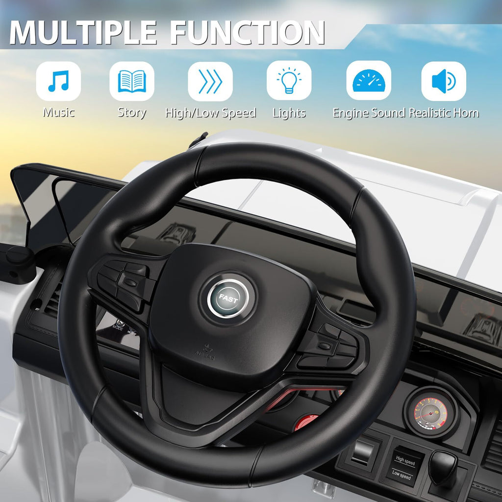 This ride-on truck perfectly balances independence and safety. Your child can take control using the responsive steering wheel and easy-to-use pedals, gaining a real sense of accomplishment as they navigate their mini truck. Meanwhile, you hold the reins with a sophisticated 2.4G remote control that offers peace of mind. You can effortlessly adjust the truck’s speed between a gentle 1.8 mph for beginners and an energetic 3.1 mph for budding speedsters. The remote also features a P-stop button, allowing you to park the truck remotely at any moment, ensuring your child's safety while still encouraging their freedom to explore.