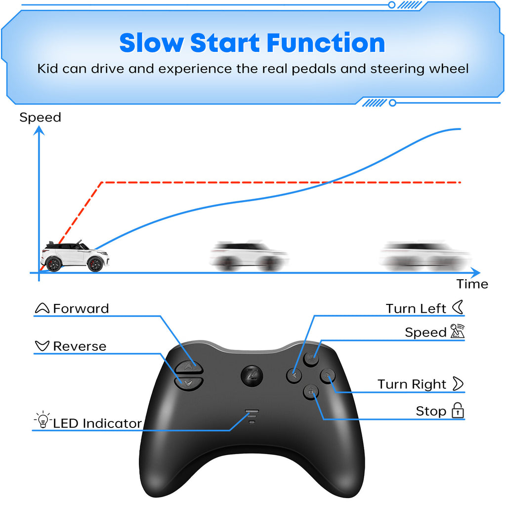 Meanwhile, kids can enjoy the thrill of manual mode, steering the car on their own and building confidence and motor skills. Safety belts secure your little driver snugly in place, while the innovative soft-start design ensures smooth acceleration, preventing any sudden jolts that might startle or discomfort your child.