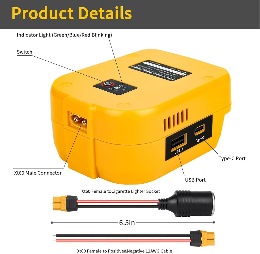 - Cigarette Lighter and XT60 Interfaces: Effortlessly connect to a variety of ride-on cars, trucks, and DIY electronic projects. The converter features intelligent low voltage protection on the XT60 output, preventing battery over-discharge, while keeping USB ports active for device charging.