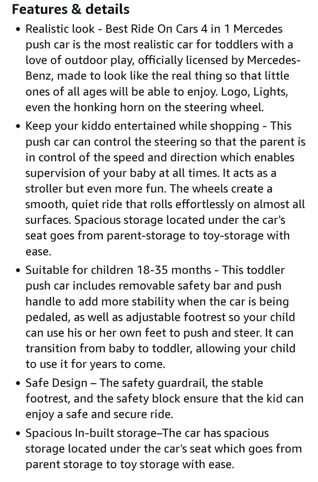Imagine your toddler's delight as they transition seamlessly from being a rocker to a ride-on, then a push car, and finally a walker. This ride-on toy is expertly designed to support your child’s evolving motor skills, balance, and coordination while sparking their imagination. The iconic Mercedes-Benz branding adds a touch of elegance and authenticity, making this toy a stylish yet practical addition to any playroom or outdoor space.