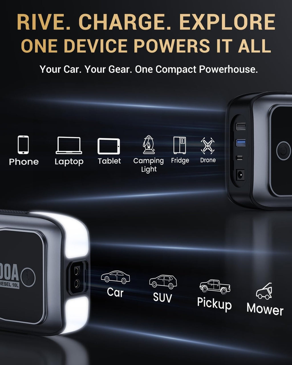 - Massive 6000 Amp Peak Current: Instantly jump starts all 12 V gasoline engines and diesel engines up to 12.0 L. From compact sedans to heavy-duty pickup trucks, the M8 delivers the surge you need, right when you need it.