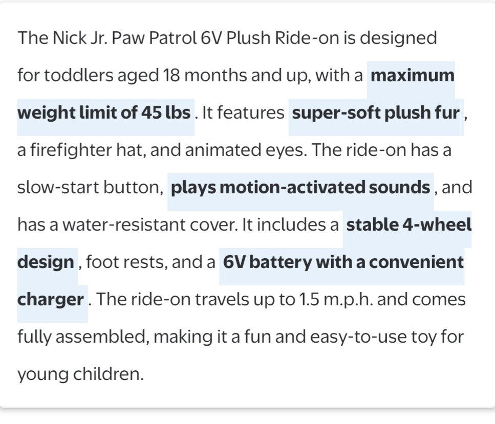 This ride-on toy is more than just a source of giggles; it’s a developmental powerhouse. As your child navigates around furniture or races their plush car outdoors, they’re building essential gross motor skills, balance, and coordination. They’ll also learn important life lessons like cause and effect—press the pedal, and the ride-on moves forward; hit the horn, and you hear Marshall speak!