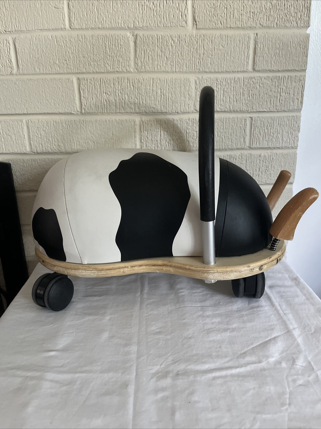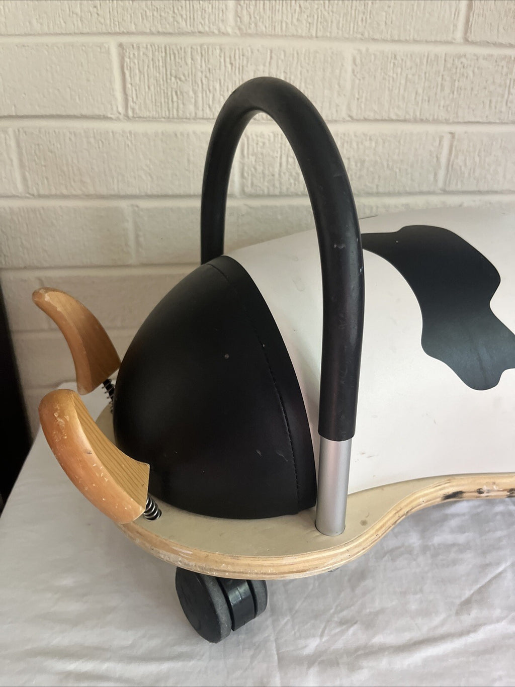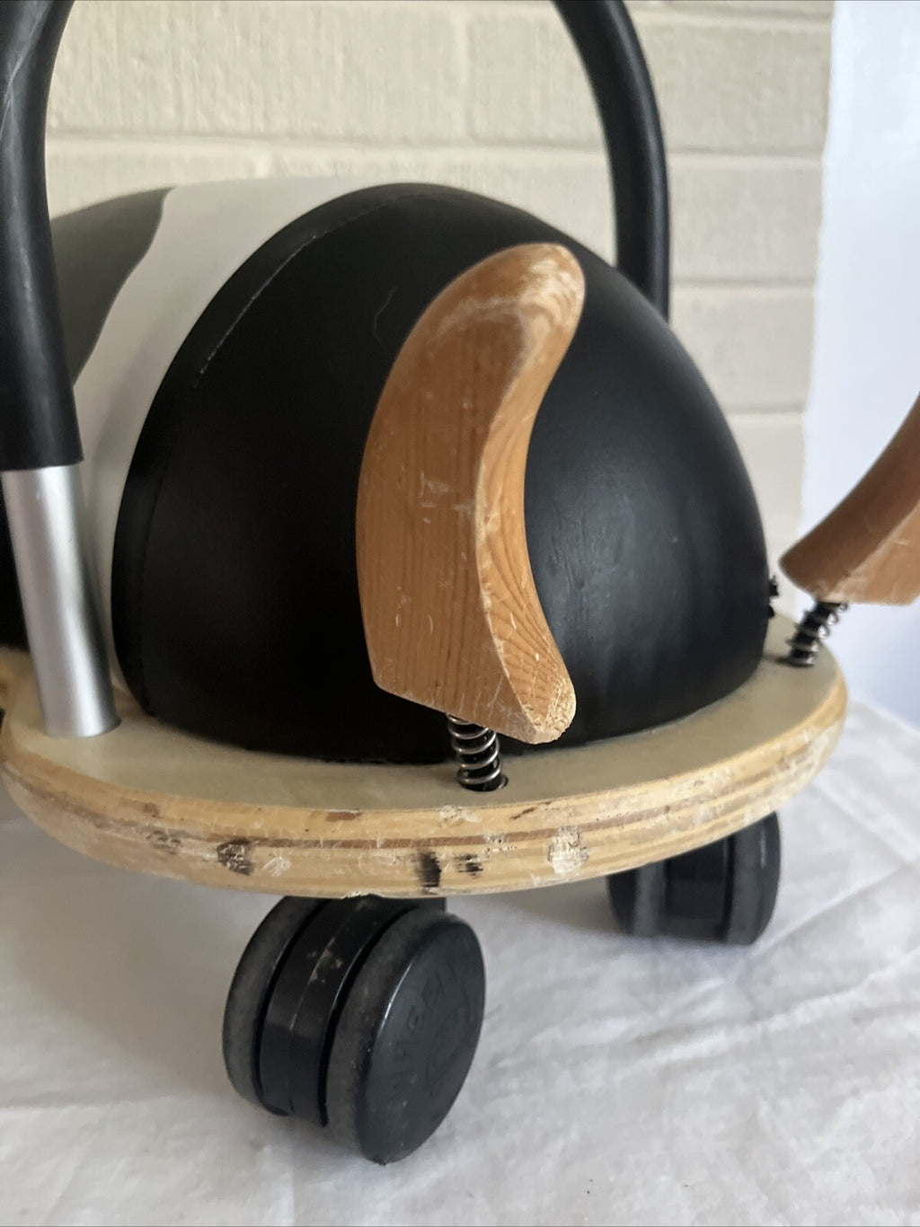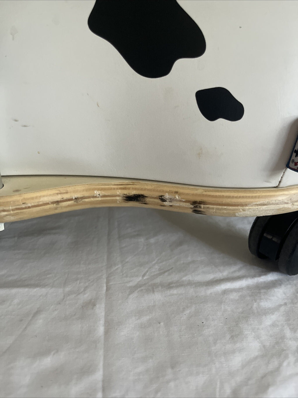 Every journey is more enjoyable with a comfortable seat! The cow-themed seat offers a soft and inviting place for your child to sit as they scoot and glide. While it shows a few snags and tiny holes—a testament to real play—these do not detract from the overall comfort. Instead, they add to the ride-on’s friendly, well-loved personality, promising your child that this trusty cow is always ready for the next adventure.
