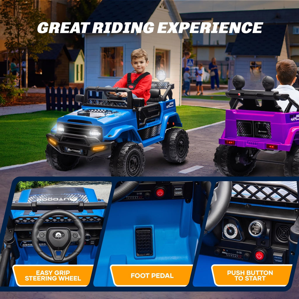 - Kid-Friendly Controls: Simple foot pedal acceleration and responsive steering wheel controls make it effortless for children to navigate their ride-on truck. They’ll develop motor skills, hand-eye coordination, and a sense of independence with every drive.