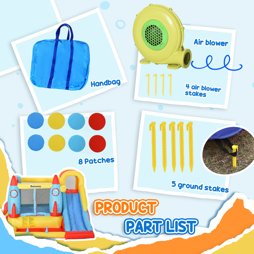 Crafted from durable 840D high-density oxford fabric, this inflatable ride-on toy is built to handle energetic play sessions rain or shine. Its robust construction means it can withstand rough-and-tumble use by multiple children simultaneously, including up to four kids sliding down at once on the generously sized slide. This durability means less worry for parents and more carefree play for the kids. The secure design includes five ground stakes to anchor the bounce house firmly in place, ensuring stability even on breezy days. Safety is paramount, allowing you to relax while your children are immersed in fun.