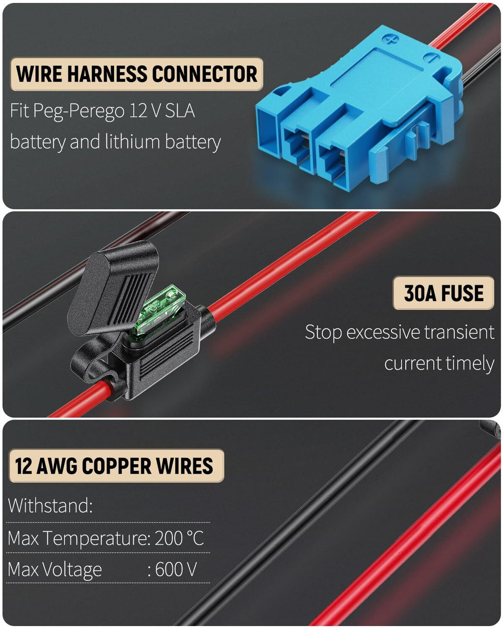 - Heavy-Duty 12 AWG Copper Wire: Engineered to withstand heat up to 392°F and voltages up to 600V, the thick copper wiring ensures stable energy flow without overheating. Benefit: Enjoy consistent power delivery and a durable connection that won’t let you down, whether you’re cruising around the block or racing through the backyard obstacle course.