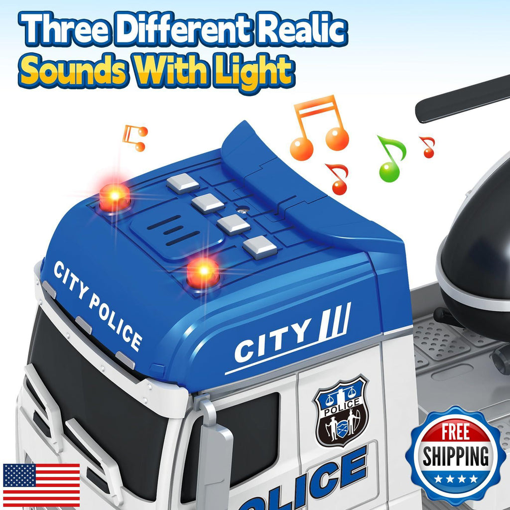 - Components Included: 1 large police truck, 1 detachable helicopter, 1 police racing car