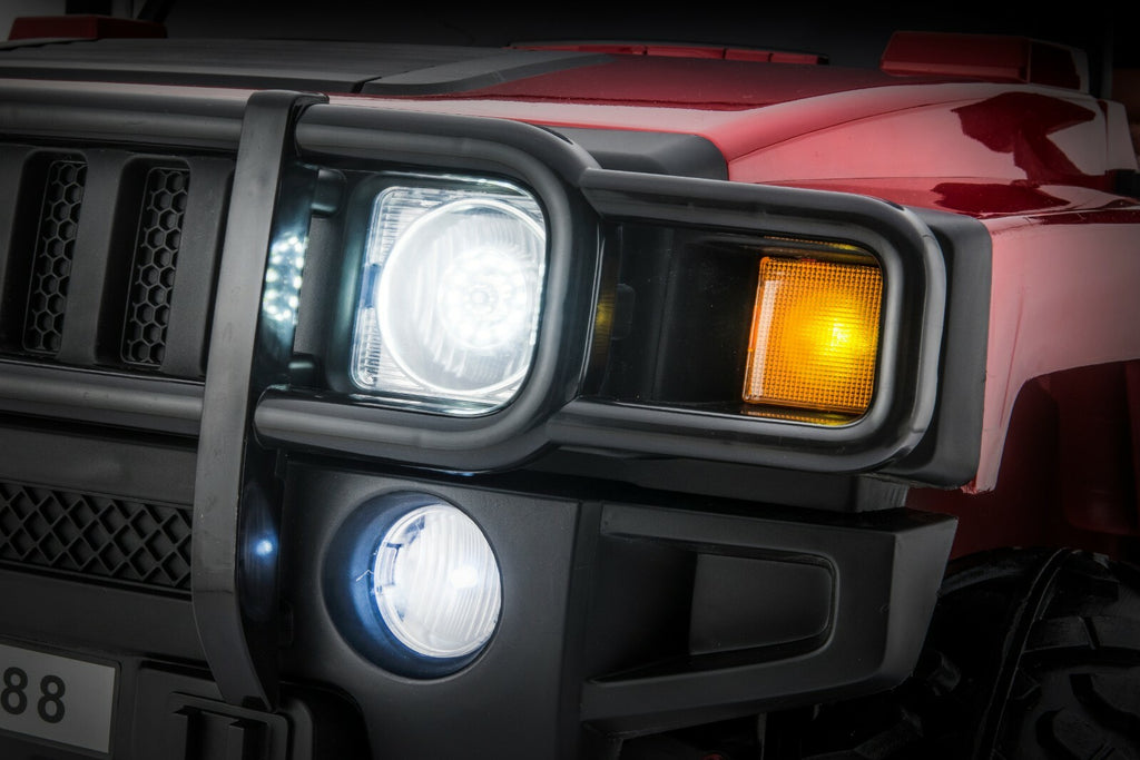Every detail of the SUPERtrax® Warrior has been crafted to create an unforgettable ride-on experience. From the robust real spring suspension that smooths out every bump to the luxurious leather seating that comfortably fits two children side-by-side, this ride-on vehicle turns ordinary playtime into a dynamic adventure. Imagine your child gripping the three-spoke steering wheel, feeling like the commander of their very own convoy, while the working LED headlights and tail lights light the way for daring quests in the fading daylight.