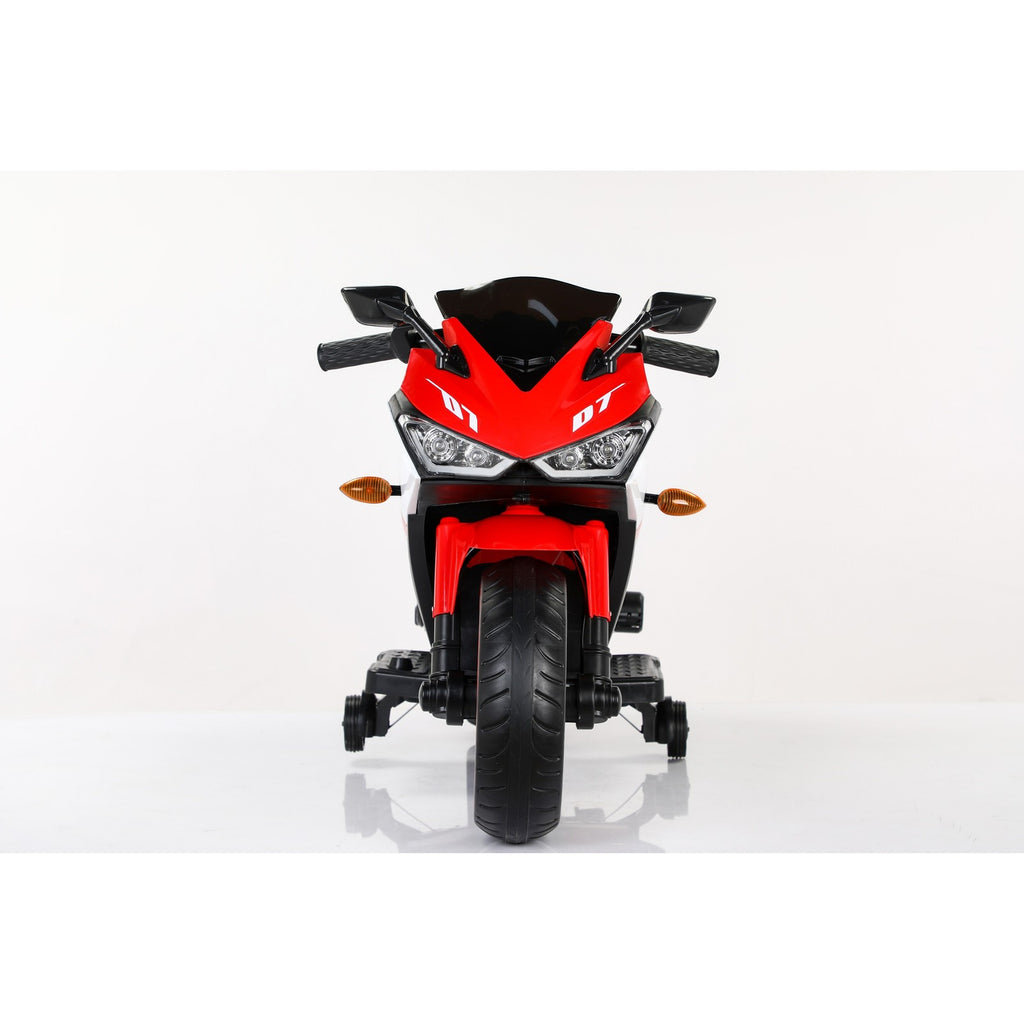 The bold red finish on this ride-on motorcycle stands out like a racing champ’s car, ready for the spotlight. Red is synonymous with speed and excitement—perfect for kids who dream of high-octane adventures. The glossy body panels catch the sunlight as they cruise by, and the red accents on the wheels glow all the brighter against the LED lights.