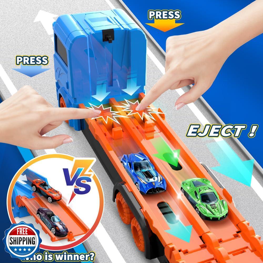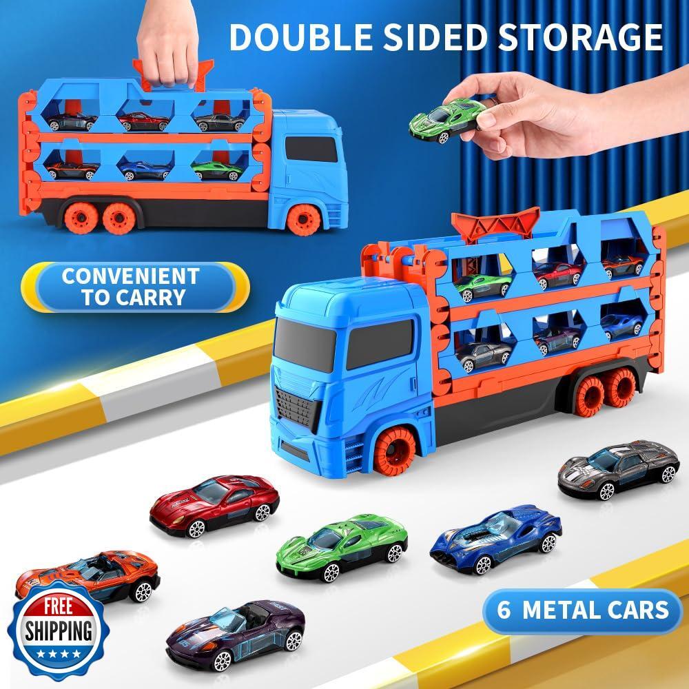 - 2-in-1 Adventure: Transforms from a hearty transport truck into a 65-inch dual track raceway in seconds, keeping playtime fresh and exciting.