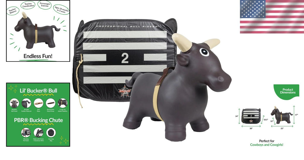 - Included in Set: Lil’ Bucker Bull inflatable ride-on, PBR pop-up bucking chute, bull rope, dual-action hand pump, and assembly guide