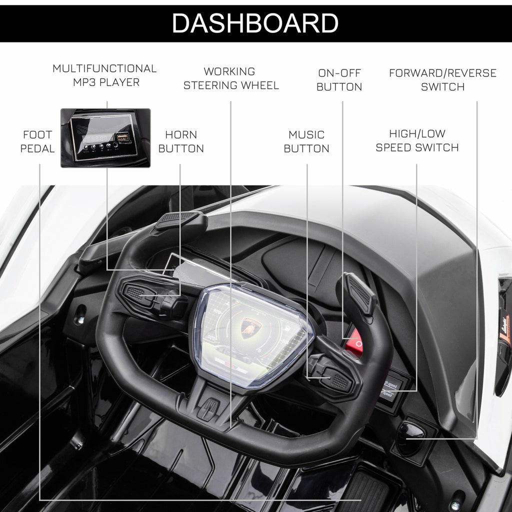 - Realistic Sports Car Styling: Officially licensed Lamborghini design with sleek, streamlined bodywork, LED headlights, taillight strips, and a cool illuminated dashboard to bring your child’s dream car to life.