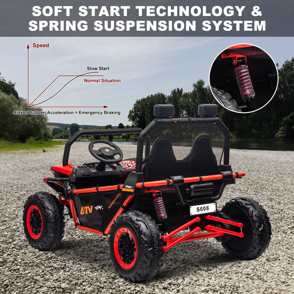 Safety is at the heart of this kids ride-on UTV. The rear wheels feature a spring suspension system that cushions the ride, providing a comfortable and stable journey even on uneven surfaces. Soft start technology ensures the truck accelerates and brakes gradually, preventing any sudden jolts that might startle young riders. The spacious seat is designed for comfort and security, encouraging kids to buckle up and enjoy every ride worry-free.