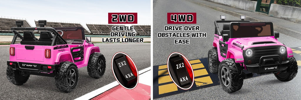 Switch between two-wheel drive (2WD) for energy-efficient cruising on flat surfaces and four-wheel drive (4WD) for extra traction on rough or slippery ground. This versatile drive system ensures your little one has the right amount of power for any adventure.