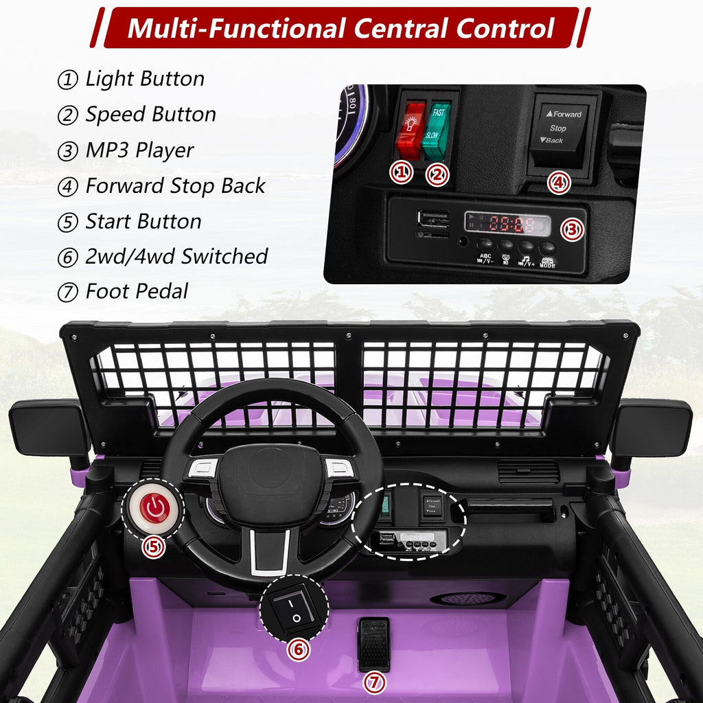 Imagine your child’s eyes lighting up as they climb into the spacious two-seater ride-on truck, ready to embark on thrilling journeys across various terrains. Whether it’s a rugged backyard trail, grassy park, or smooth pavement, this ride-on truck Jeep is engineered to conquer it all with ease. Thanks to the advanced 4WD/2WD switchable motor system powered by four robust motors and a rechargeable 24V 7AH battery, your child enjoys versatile power options. Engage 4-wheel drive mode for off-road excitement with superior traction and control, or switch to 2-wheel drive to maximize battery life and cruise efficiently on flat surfaces for up to two hours of continuous fun.